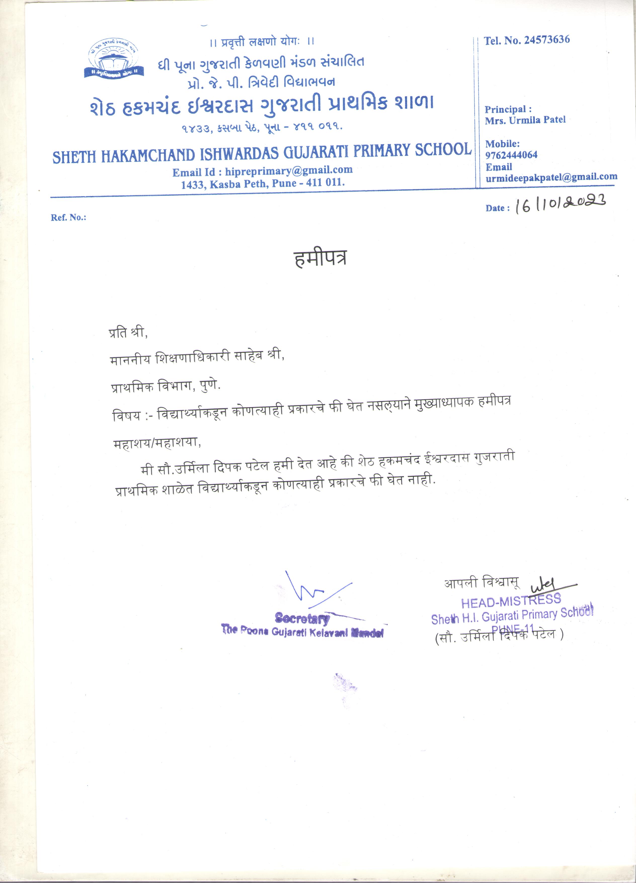 7 विद्यार्थ्याकडून कोणतेही फी /देणगी घेत नसल्याचे मुख्याध्यापक हमीपत्र डाउनलोड करा