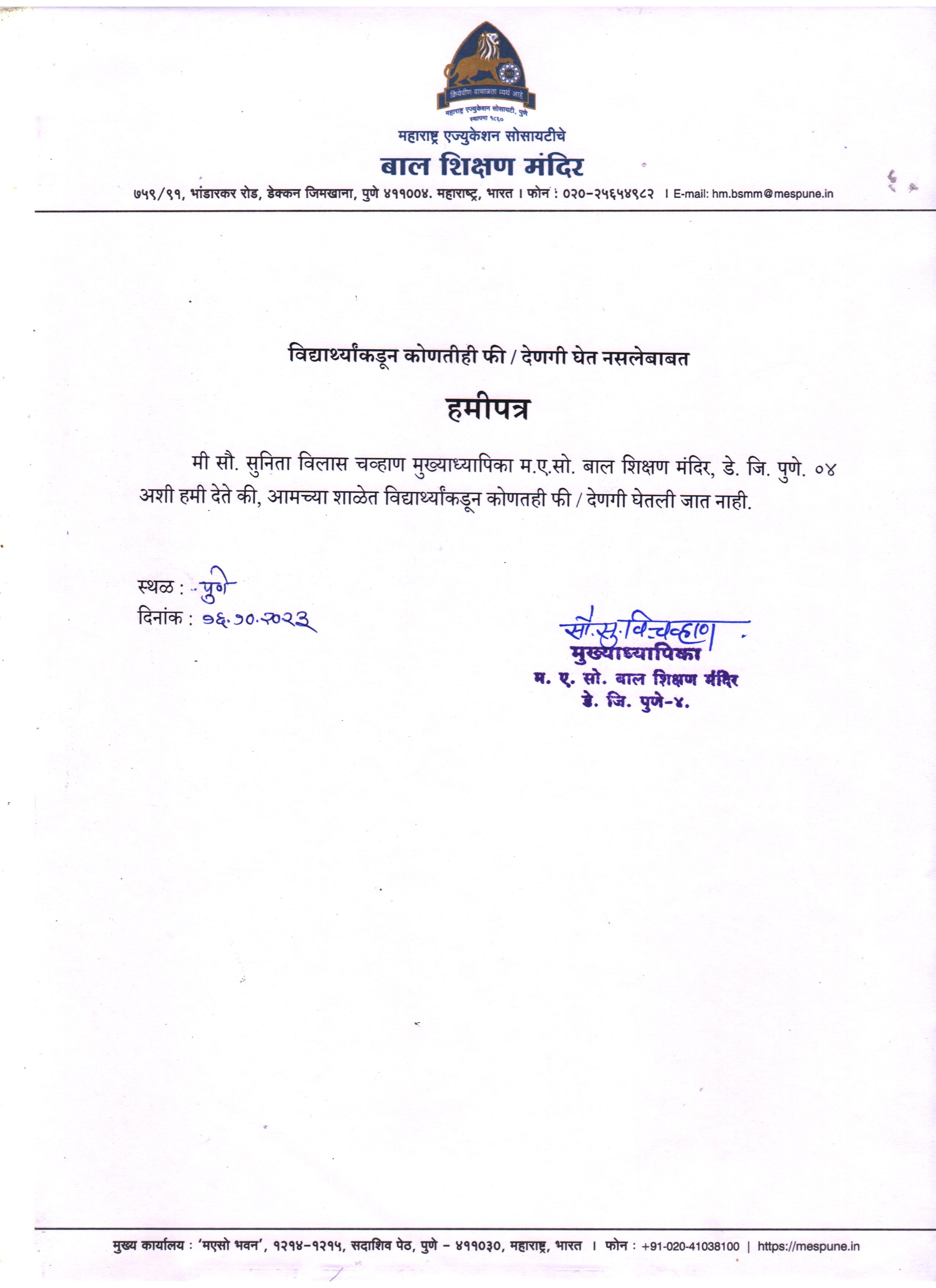 7 विद्यार्थ्याकडून कोणतेही फी /देणगी घेत नसल्याचे मुख्याध्यापक हमीपत्र डाउनलोड करा